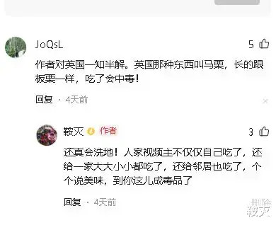 我的文章发表后,评论区真人是让人开眼,一大堆跑来给中国人科普的,说这不是板栗,吃了要死人,但是视频里的英国宝妈不仅自己吃了,还给一家人和邻居都吃了,结果英国人不知道这东西可以吃,说真美味。